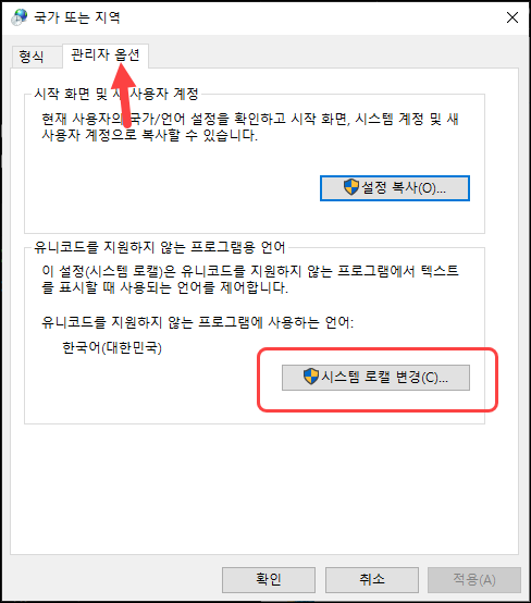 2. 윈도우 국가별 설정 들어가서 컴퓨터 내에 전세계언어 다되는 unicode UTC-8 체크하기