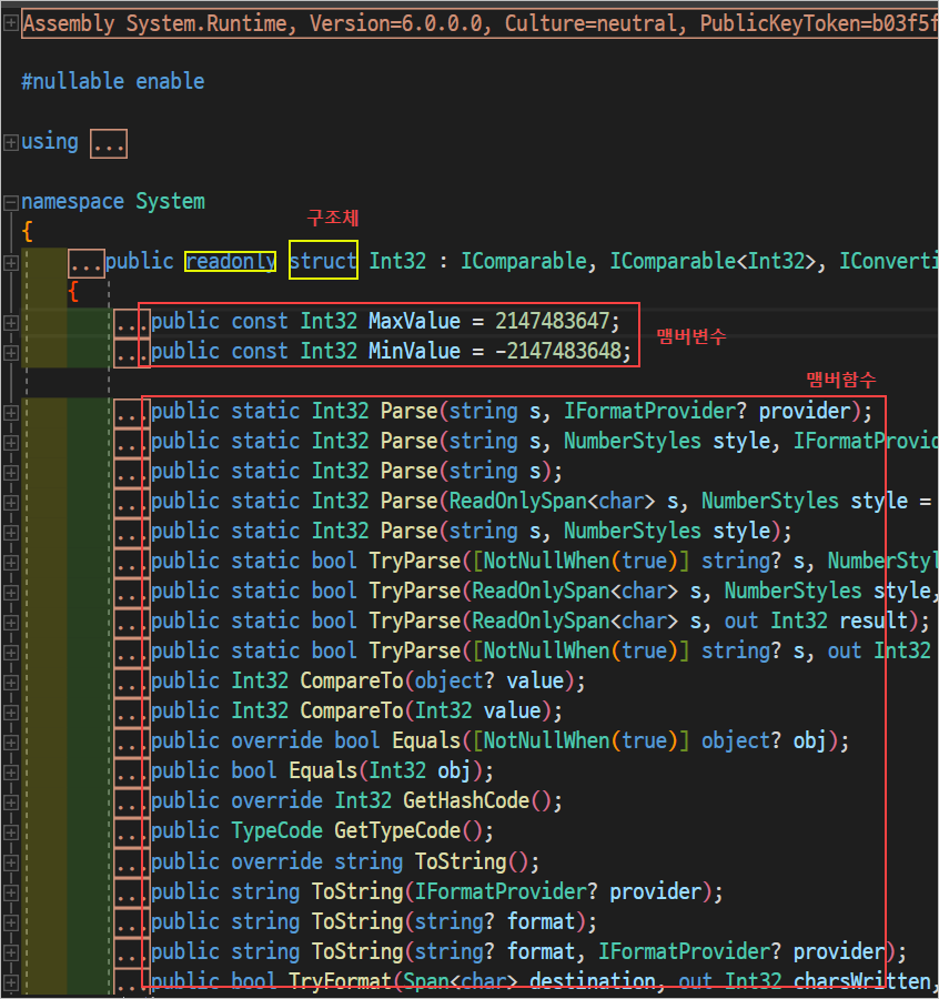 * 자료형은 C#에서 만들어둔 구조체이다(int,double등등) String은 클래스네