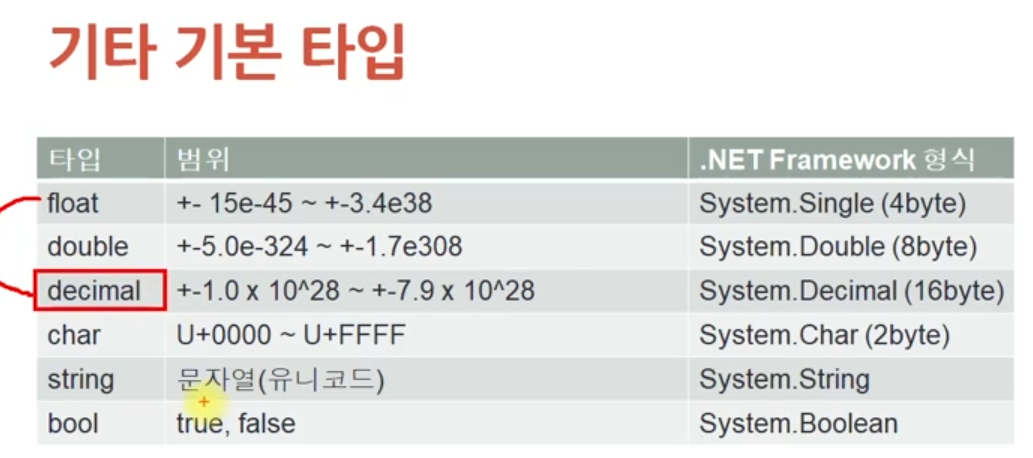 * 실수(소수)가 필요할땐 decimal을 주로쓴다 (float와 double는 근사치 약간의 오차가있는 반면 이것은 정확하다)