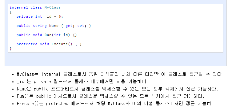 접근 제한자는 public class A {} 와 같이 클래스, 구조체와 같은 Type 앞에 사용하거나 메서드, 속성, 필드 등의 클래스/구조체 멤버 앞에 사용하여 (예: protected int GetValue(); ) 접근을 제한하게 된다.