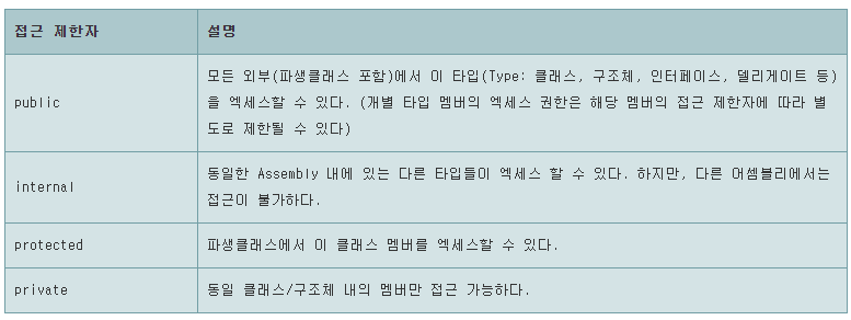 클래스 멤버는 5가지의 접근 제한자를 (public, internal, private, protected, protected internal) 모두 가질 수 있지만,