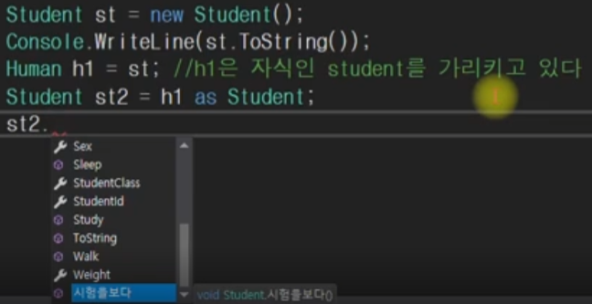 Student st2 = (Student)h2; //이건 오류가 발생한다 h2가 가르키고 있는 객체에는 Stduent가 없지